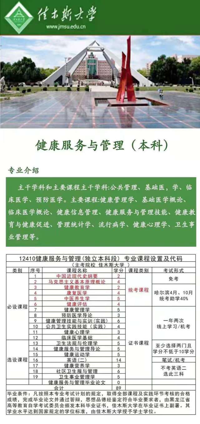 佳木斯大学提升专升本学历可报考健康服务与管理有助学学位 黑龙江佳木斯大学健康服务